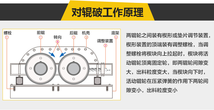 輥式破碎機(jī)是利用輥面的摩擦力將物料咬入破碎區(qū),使之承受擠壓或劈裂而破碎的機(jī)械。當(dāng)用于粗碎或需要增大破碎比時,常在輥面上做出牙齒或溝槽以增大劈裂作用。