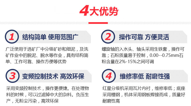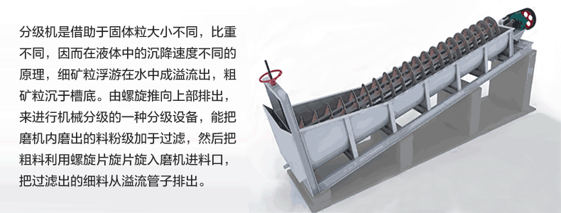 螺旋分級機(jī)是選礦的設(shè)備之一,螺旋分級機(jī)借助固體顆粒的比重不同,因而在液體中沉淀的速度不同的原理,進(jìn)行機(jī)械分級的一種設(shè)備。螺旋分級機(jī)應(yīng)用于處理沖積砂礦,尤其適合于有用礦物單體解離度高而且呈扁平狀者。分級機(jī)主要有高堰式單螺旋和雙螺旋、沉沒式單螺旋和雙螺旋四種分級機(jī)。