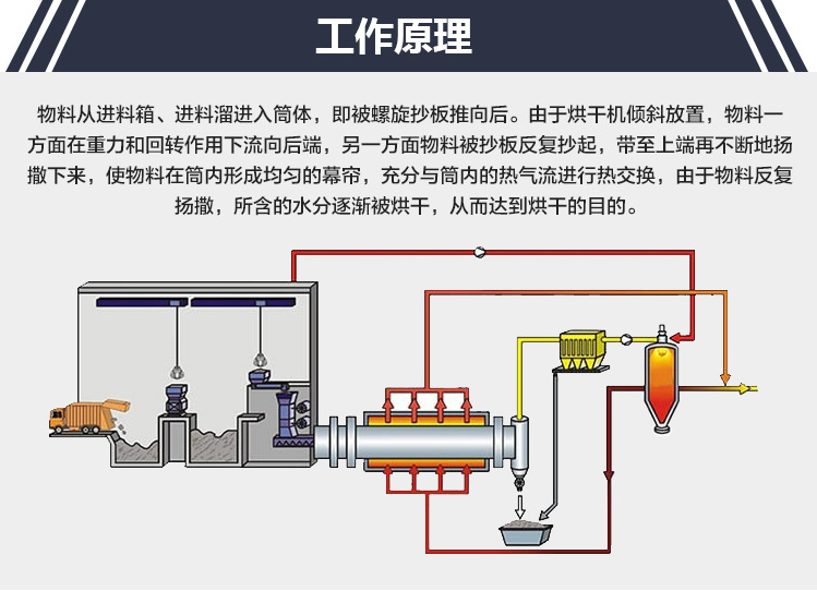 在筒體內(nèi)壁上裝有抄板,它的作用是把物料抄起來又撒下,使物料與氣流的接觸表面增大,以提高干燥速率并促進物料前進。載熱體一般分為熱空氣、煙道氣等。載熱體經(jīng)干燥器以后,一般需要旋風(fēng)除塵器將氣體內(nèi)所帶物料捕集下來。如需進一步減少尾氣含塵量 ,還應(yīng)經(jīng)過袋式除塵器或濕法除塵器后再放排放。